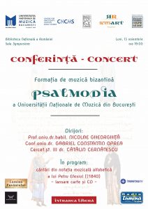 La finele proiectelor, ne-am bucurat de un concert susținut de formația Psalmodia a Universității Naționale de Muzică din București, coordonată de prof. univ. dr. habil. Nicolae Gheorghiță, și de o dublă lansare de carte și CD: volumul Antologhion I de Petru Manuil Efesiul, transcris din notația muzicală alfabetică de CS III dr. Cătălin Cernătescu, și albumul Ephesios & Lesvios REDISCOVERED al grupului Psalmodia. De asemenea, s-au lansat și cele două volume ale manuscrisului Noul Doxastar de Amfilohie Iordănescu, îngrijite de George Matei, George Antoneac, Dragan Olariu și Mihai Dobre, sub coordonarea științifică a prof. univ. dr. habil. Nicolae Gheorghiță și CS III dr. Cătălin Cernătescu.