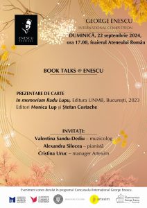 🗓️Duminică, 22 septembrie, ora 17:00, în foaierul Ateneului Român,                                                                         va avea loc prezentarea volumului In memoriam Radu Lupu, îngrijit     de Monica Lup și Ștefan Costache, apărut la Editura UNMB, în 2023.   Participă autori ai volumului, alături de invitații care vor lua cuvântul: